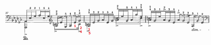 37小節目からは不規則な分散和音の中に付点リズムのメロディーが加わる。ちなみに、赤字の数字は私の指使いであり、かなり変則的な指使いだが付点メロディーをくっきりと響かせることが可能になる・・・と思う。その前の変ホ音も 1 で弾くことになるので指使いは案外覚えやすくなる。