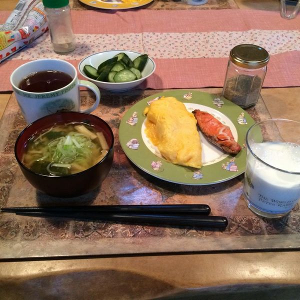 | 朝はチーズや釜揚げジャコ入りオムレツ、鮭、味噌汁、コーヒー(粉は生姜を乾燥させたもの味噌汁に入れます)。仕事のある日はこればっかりです。 |