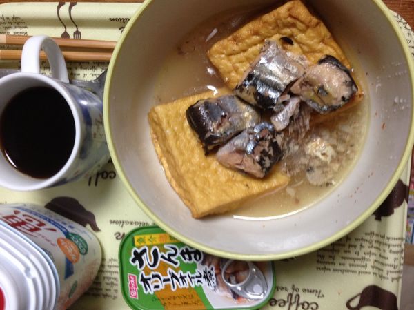 さんまのオリーブオイル煮 と厚揚げ の一品 … (糖質量 不明) 厚揚げを電子レンジで温め、さらに缶詰めと合わせて、さらに加温。お好みで野菜を添えて |