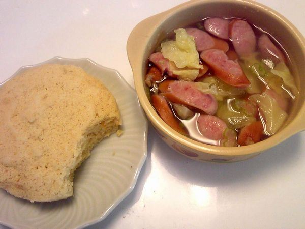 数口食べてから思いついて写真を撮ったので、食べかけ画像で失礼致します。左の皿が「おからケーキ」、右は「ソーセージとキャベツとセロリのスープ」です。普段は温めたソーセージやベーコンと野菜炒め、卵を気まぐれに調理(出汁巻きだったり茹で卵だったり目玉焼きだったり…)して朝ごはん(一日二食なので実質ブランチ)にしています。 便秘が気になる時や、どうにもパン的なものが食べたい時に「レンジでチン! おからケーキ」を作っているのですが、最近レシピが安定してきたので報告します。オーブンを使わないので、準備開始から「いただきます」まで15分程度になると思われます。 「レンジでチン!おからケーキ」の作り方