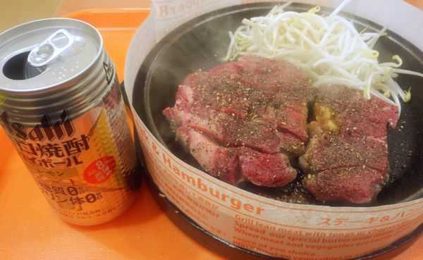 いきなりステーキにまた行って来ました。 今度はランチメニューです。糖質制限オプションで注文してみました。 ワイルドステーキ300g。1200円(税抜)のところ、ライス抜きで1100円(税抜) 付け合わせもなし。 バターのみ。 鉄板の上で好きな焼き具合になるまで放置してから、ステーキソースをかけて食します。味は赤身の部分が美味しいと思いました。 |