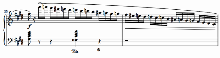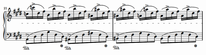 右手の速いパッセージと左手のアルペジオの低音を組み合わせているが、実際に弾いてみるとわかるが、原曲の雰囲気をかなりの水準で再現していて、かなり見事な編曲だと思う。テンポを考えると演奏は楽ではないが、弾く価値はあるだろう。