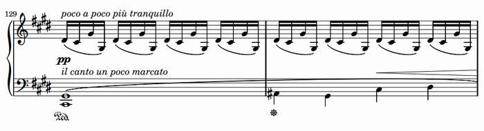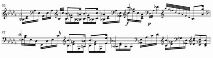 70小節目から伴奏音型はさらに細分化し、音域が広がることで響きはさらに豊かになっている。