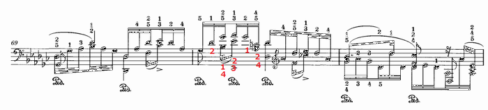 最後の近い部分の70小節目も地味に難しい。楽譜の指使いだと1拍目の最後の和音が [4, 5] となって弾きにくい。そこで赤字の私の指使い。ゴドフスキーにはよくあるタイプの指使いで、これだと最後の和音が弾きやすくなる。