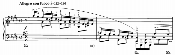 主部の冒頭部分。10小節目4拍目の赤字は私の指使い。嬰ハ短調だと11小節の下降パッセージは弾きやすいが、ハ短調に戻してみるとかなり無理な指使いになると思う。