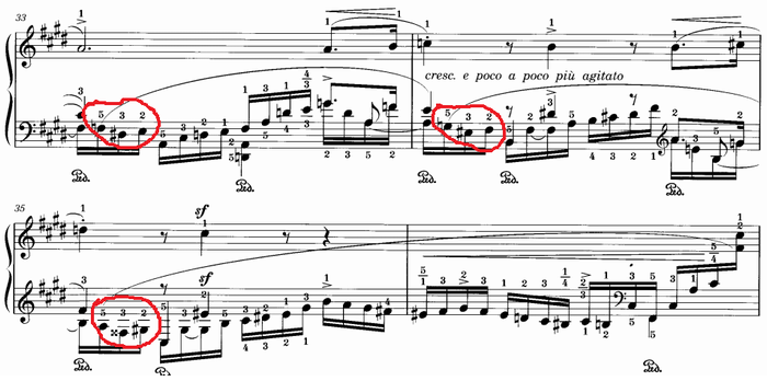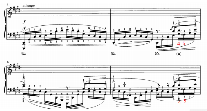 主題再現部の直前の部分。赤丸の [4] と [5] の5度の跳躍は音を外しやすいが、ゴドフスキーによくある指使いである。