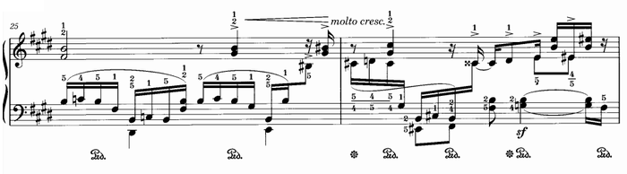 おそらくこの曲で最も演奏困難で厄介な部分。伴奏の16分音符は跳躍とトリルが連続し、上声部のメロディーを正確にミスなく弾くのはかなり大変である。
