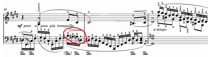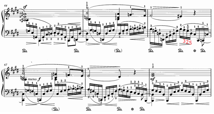 65小節目からの4小節も同様の特殊な指使いが連続するが、高音部のメロディーと低音部の素早い16分音符を明確に弾き分けるのはかなり大変だ。