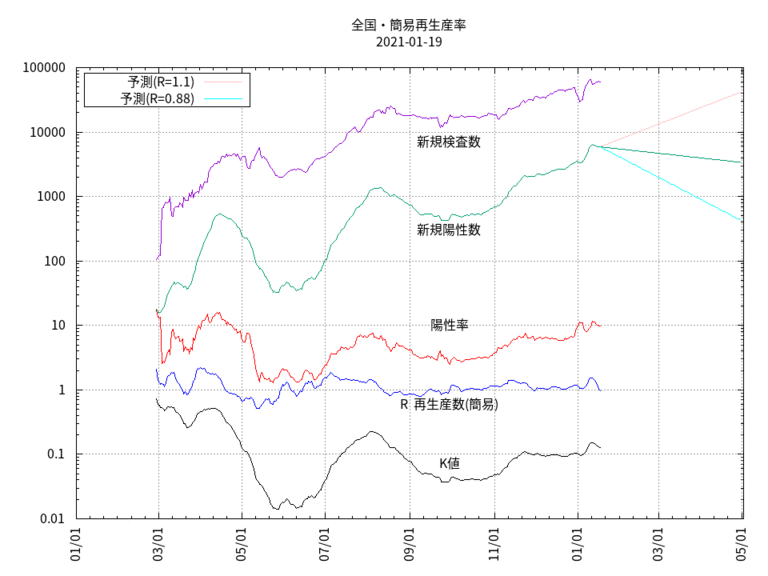 東京のアニメーションです。 全国のアニメーションです。 東京と全国の単独グラフです。 陽性者数の多い地域のグラフに代えて、まんぼー対象地域に絞ったグラフを作成しました。 先行した宮城県は50日ほどの増加期間を経て、すでに減少傾向になっています。 グラフのパターンでは、宮城、沖縄、兵庫、大阪、京都の順に増加開始とみられますが、二番手の沖縄が宮城とどうように50日程度で頭打ちするかどうかが気になるところです。