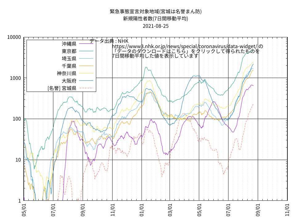 東京、全国のグラフと非常事態宣言地域・まん防対象地域のグラフです。 東京は再生産数(簡易版)が 1を下回りました。全国ではまだまだ増加傾向です。都市から地方へという蝸牛現象のようです。 過去のパターンからいくと東京はすでにピークを打ったように見えます。