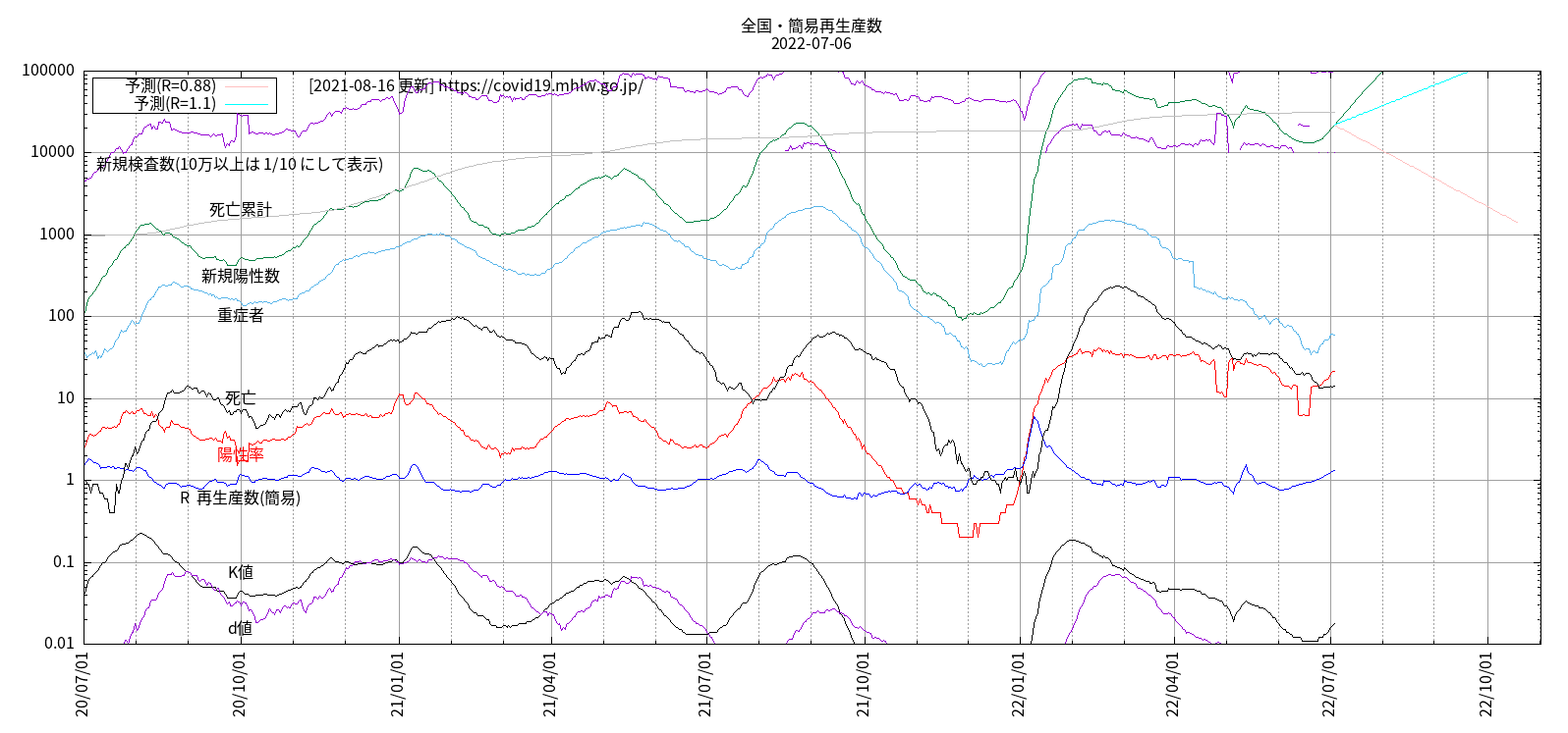 先週心配したことが現実となったようです。東京・全国ともに第六波は終わり、次のステージになったと考えられます。 どちらも陽性率が 20%に上昇し、再生産数 R(簡易)も 1.5 になろうとしていて、重症者も増加に転じました。