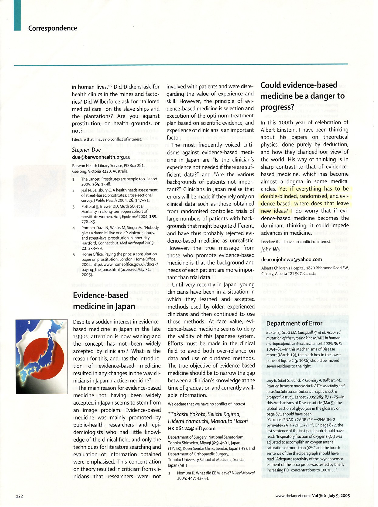 - 11月28日のこのコーナーでLancetの論文を紹介しましたが,最近のLancetにさらに痛快な文章が載っていたと,高知県の宮本先生に教えていただきました。ありがとうございます(The Lancet 2005; 366:122)。