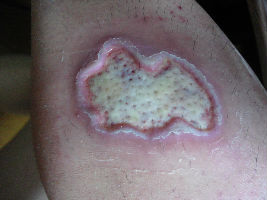 - 12月3日夜:患部に電流を流されたような不愉快な痛みが起こるようになる。ゲーベンを洗い流して被覆材を交換すると、痛みが収まった。形成外科医の診断に疑問を抱き、自己治療に切り替え。写真による記録を開始する。ゲーベンクリームは破棄。
