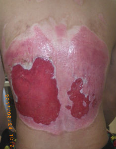 2011年2月10日,溶接作業中に衣服に引火して背部全体に熱傷。直ちに茨城県の土浦協同病院に救急搬送され,皮膚科入院となる。入院中はゲーベンクリームで治療を受けていた。