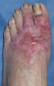 当科では当初はOpWTで,その後はプラスモイストで創部を被覆した。なお,ドレッシングは全体を一つに覆うのみとし,第1,2趾間にガーゼを挟むようなことはしていない。