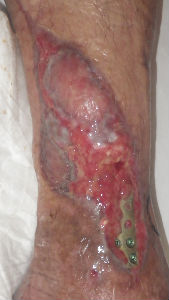 当科初診時の状態。左下腿内側にプレートは露出しているが,発赤や圧痛などの感染症状を認めなかったため,水道水で洗浄し,OpWT(穴あきポリ袋+紙オムツ)で創部を被覆した。そして,後日入院ということにして,この日は帰っていただいた。
