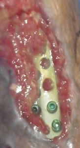 11月25日の創部の様子。わずか数日でプレートの上に肉芽が伸びているのがわかる。もちろん,局所の感染症状(圧痛,発赤,腫脹など)は全く見られない。つまり,感染は起きていない。