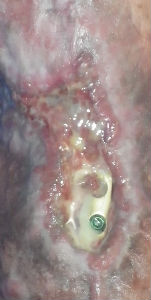 12月13日の状態。プレートが肉芽に覆われて見えなくなってきた。ちなみに,しつこいと思われるだろうが,治療は「抗生剤なし/普通に風呂で入浴/創部はOpWT(穴あきゴミ袋+紙オムツ)で覆うだけ」である。