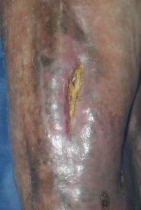 私は,この症例のような下腿は慢性骨髄炎でなく,単なる「皮膚壊死による骨の露出」だと考えている。要するに「骨の露出」と「骨髄炎」は全く別物なのだ。
