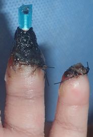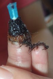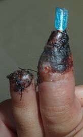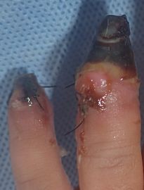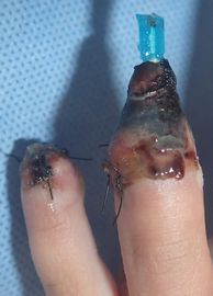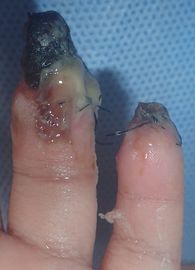 環指,小指ともに縫合部より遠位は完全に壊死し,環指は注射針で固定されていた。当科ではプラスモイストで被覆し,[壊死組織の自然脱落⇒上皮化]で治療。