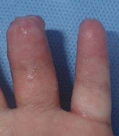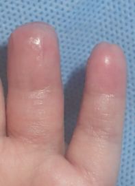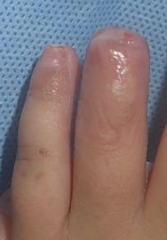 両親の休暇でイタリア旅行中の8月5日,ホテルのガラステーブルをひっくり返して左手環指の不全切断,小指の指尖部損傷受傷。ナポリの病院を受診し,手術を受けて4日間入院。その後,インドに戻り病院を受診したが,壊死しているので切断が必要と言われた。ネットで調べて一時帰国の上,当科を受診。