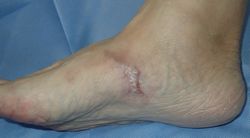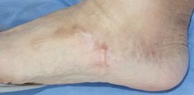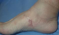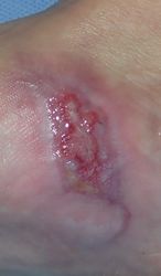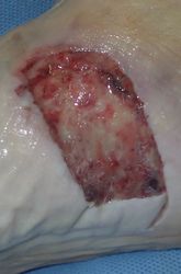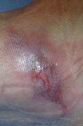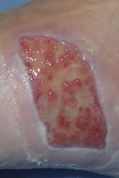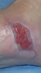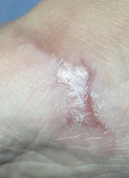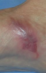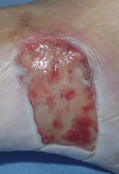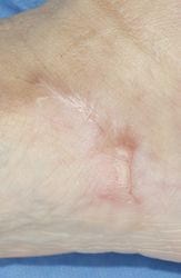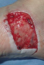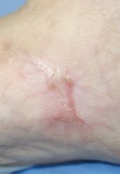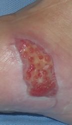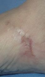 同日,当科を受診。右足内側に6×3.5センチの全層皮膚欠損を認めた。3ヶ月近くかかると思うが皮膚移植しなくても治るし,感染が起こるわけでもないと説明。ヘモスタパッドで創部を被覆した。受診時は痛みのために杖をついて診察室に入ったが,帰宅してからは杖なしで歩けるようになったとのことだった。