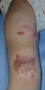 ドイツに在住していた2013年12月17日,テーブルの上の熱湯の入ったカップに手を伸ばしてひっくり返し,右上腕,前胸部に熱傷を受傷。デュッセルドルフの〇〇病院小児外科に入院となった。軟膏とガーゼの治療だった。その後,上腕に肥厚性瘢痕を生じ,シリコンシートと圧迫ガーメントで治療しているが,痒がっている。