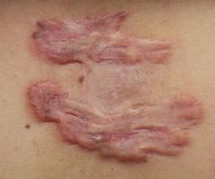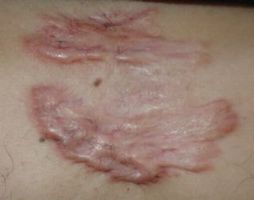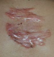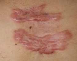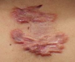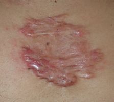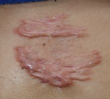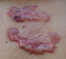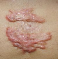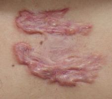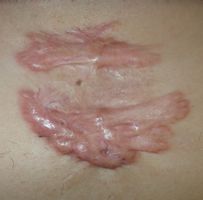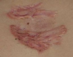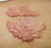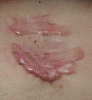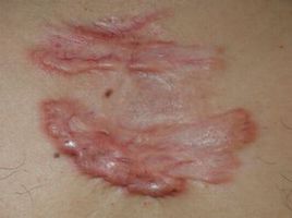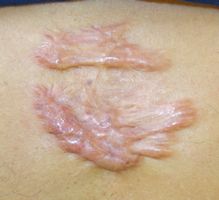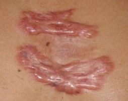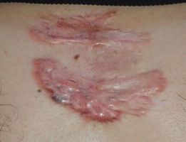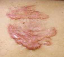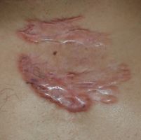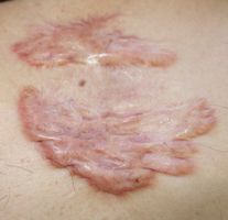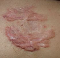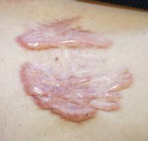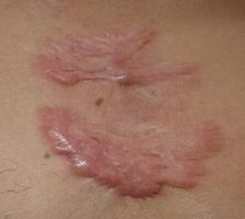 20年前に前胸部正中のニキビの痕が盛り上がってきて,ケロイドになった。これまで3つくらいの病院,クリニックでステロイド剤の注射をしてもらったが治らない。ネットで調べて2013年2月6日に当科受診。