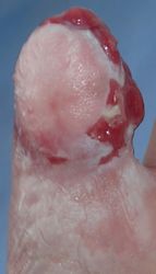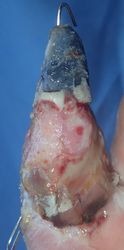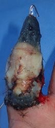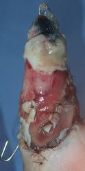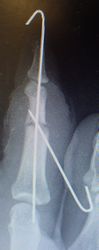 当初はラップで被覆(ワイヤーのためにプラスモイストではうまく覆えなかった)。1月21日,22日にワイヤー抜去。3月に入ってから突出した骨を骨鉗子で切除(無麻酔で大丈夫だった)。3月19日,八丈島に戻った。