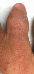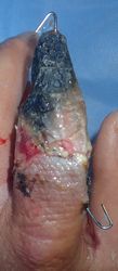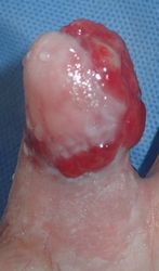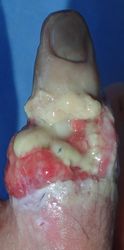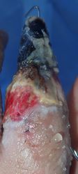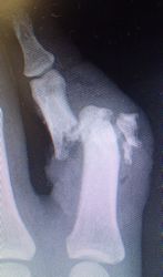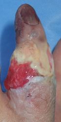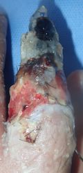 2014年12月29日,ワイヤーに左示指を巻き込まれて不全切断受傷。〇〇病院を受診し,直ちに△△病院に救急ヘリ搬送され,形成外科で緊急手術(再接着術)となったが,生着せず,手掌部で切断⇒断端形成の予定だったが,患者の叔母(東京在住)がカンボジアで湿潤治療をしているKEN CLINICの奥澤先生と知り合いだったため,当科で一度診てもらったほうがいいとアドバイスされ,セカンドオピニオンで当科を受診。