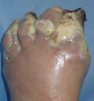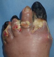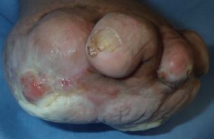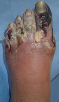 左第1趾が黒くなっていることに家族が気付き,4月28日に〇〇病院受診。直ちに当科紹介となった。受診時,第1趾だけでなく他の足趾にも循環不全を認め,足背遠位の皮膚も一部壊死していた。また,全身状態も極めて不良のため,糖尿病内科紹介し,直ちに入院となった。この時は下腿での切断になるかな,と考えていた。創部は「穴あきポリ袋+紙おむつ」(勝手に鳥谷部先生のサイトにリンク)で一応覆っておいた。