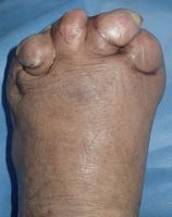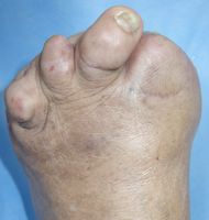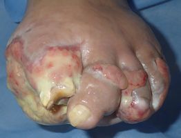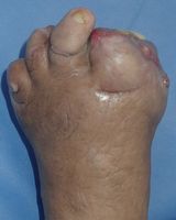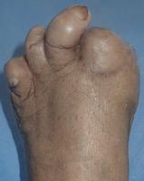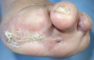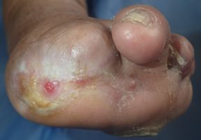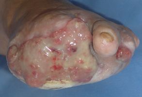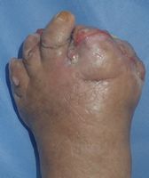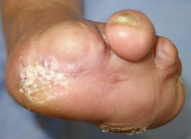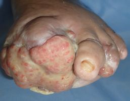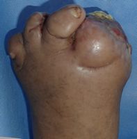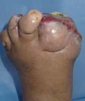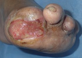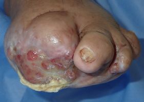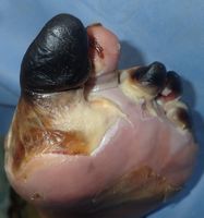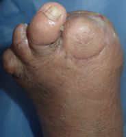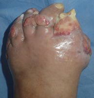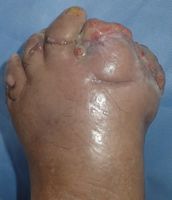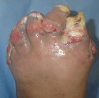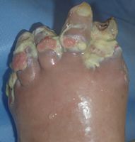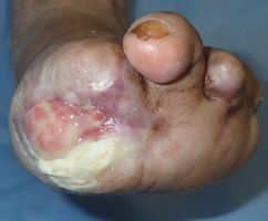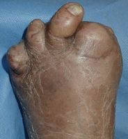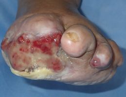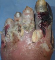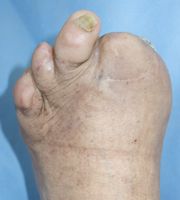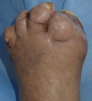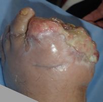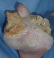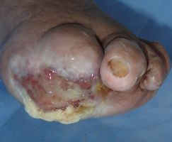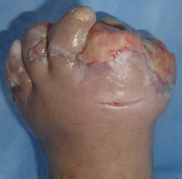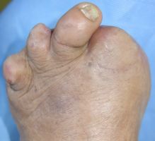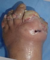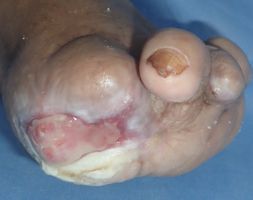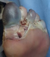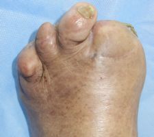 内科主治医と相談し「局所の循環が改善したので,壊死組織の切除のみで行けるかもしれません。下腿切断はいつでもできるので,最後の手段としてとっておきましょう」ということになり,壊死した足趾を外来診察室で関節部離断を5月20日から開始。第1趾はIP関節で離断し,その後,突出した基節骨先端を骨鉗子で除去。