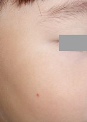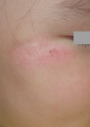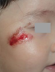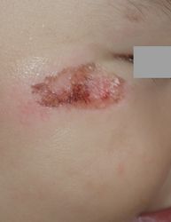 2015年7月19日,自宅ベランダから転落して顔を擦りむいた。21日,〇〇皮膚科医院を受診し,ゲンタシン軟膏が処方された。ママ友が当科受診をアドバイスしてくれた。