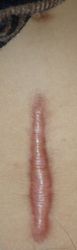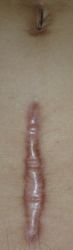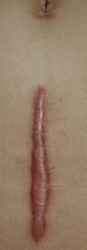 2015年4月,〇〇大学付属△△病院産婦人科で帝王切開にて出産。傷跡が目立ち,痛みもあるため,ネットで調べて当科を受診。治療法について説明し,ドレニゾンテープの治療を選択。