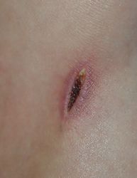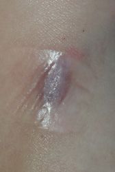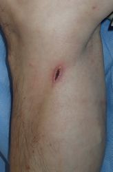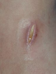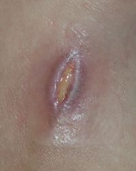 71歳男。 2015年今年9月28日,当院心臓血管外科で両側下肢静脈瘤に対し血管内焼灼手術施行。右下腿の傷が1カ所治らないため,当科紹介となった。 10月27日,当科受診。ハイドロコロイド被覆材で治療。