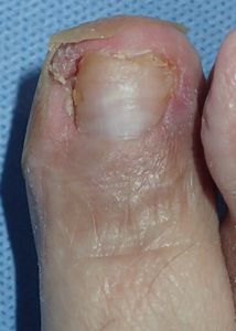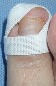 2015年10月28日,「数日前に右第1趾を深爪してから爪の脇が痛い」と受診。陥入爪のテーピング治療について説明し,ハイドロコロイド被覆材を貼って皮膚を保護し,その上からテーピングした。