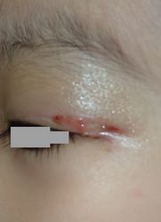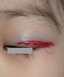 2015年10月14日,幼稚園で転倒し,左上眼瞼裂傷。直ちに当科を受診。