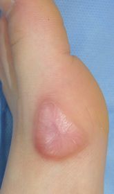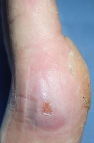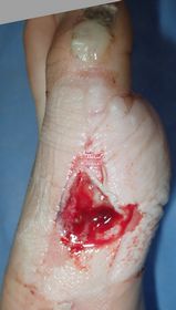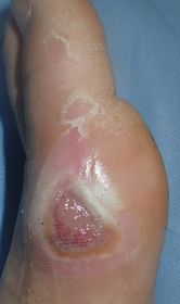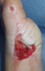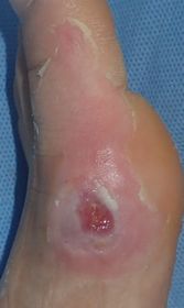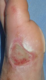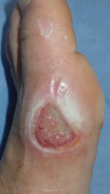翌日,当科を受診。左第1趾MTP関節部に直径2センチ大の全層皮膚欠損あり。プラスモイストで被覆。