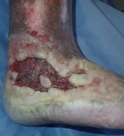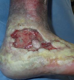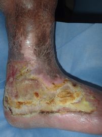 2000年ころから右下腿に傷ができて,次第に深くなった。〇〇大学附属病院皮膚科に通院し,2度皮膚移植を受けたが皮膚は生着しなかった。今年に入り,同院循環器科で診てもらったが,医師から「浸出液が悪い。これが傷の周りの皮膚を腐らせ,潰瘍が拡大している原因だ。浸出液を止めないといけない」と説明され,カデックス軟膏が処方され,傷口をカデックスを埋めるように指導された。