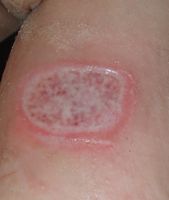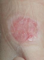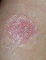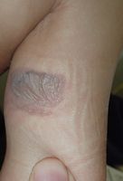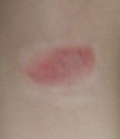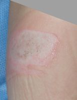 2015年10月29日朝,ヘアアイロンに触れて左上腕内側に熱傷受傷。直ちに当科を受診し,プラスモイストで治療。