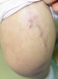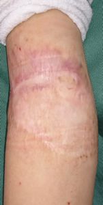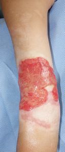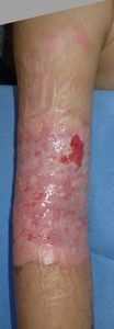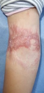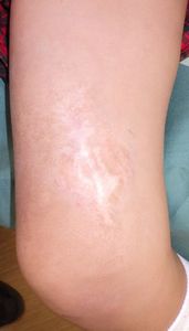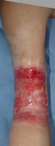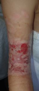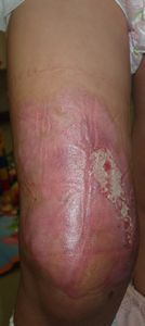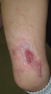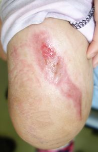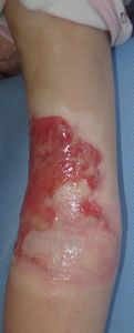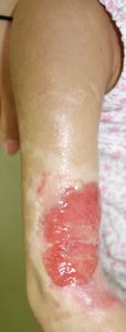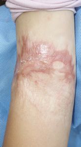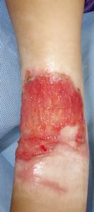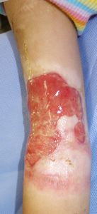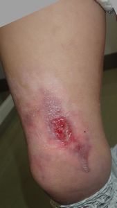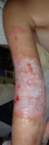 2016年1月8日,母親の料理の手伝いをしていて鍋をひっくり返し,右上腕,右大腿に熱傷受賞。〇〇病院に救急搬送。プロペトとトレックスガーゼで治療。その後,同院形成外科に通院。14日からフィブラストスプレー®になったが,噴霧直後から気が狂ったように泣いて暴れるようになり,その様子を見ていられなくなった母親がネットで熱傷について検索し,当科に紹介状を書いてもらった。