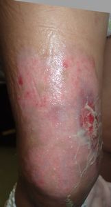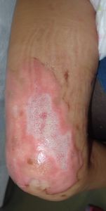 1月19日,当科受診。創面全体が3度熱傷の状態であった。血量に長期を要することを説明し,穴あきポリ袋と吸収シートでの治療を開始。