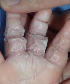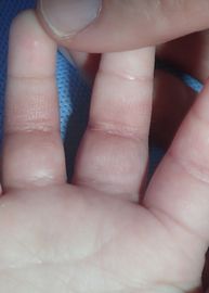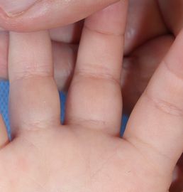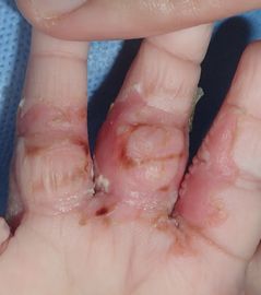 2016年1月13日,当科受診。直ちに水疱膜を除去し,浅いヤケドと説明。ミトン型にしたプラスモイストで治療。10日で上皮化完了。