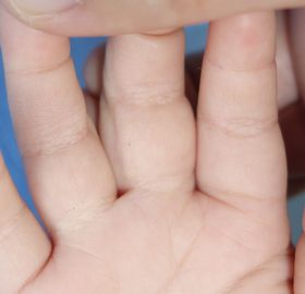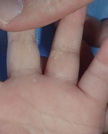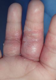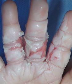 2016年1月8日,加湿器の蒸気で右示指,中指,環指掌側に熱傷受傷。〇〇病院ERに救急搬送され,10日まで同科でアズノール軟膏で治療。△△大学附属病院形成外科に紹介され12日に受診。アズノール軟膏で治療。