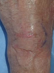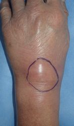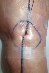 左手関節背側に直径4センチの皮下腫瘤があり,局所麻酔下に中心部を1センチほど切開した。内容物からガングリオンと思われた。2本のナイロン糸を頭側と尾側に向けて挿入。絆創膏で固定し,ズイコウパッドで被覆。