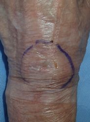 数日前から左手背が腫れて痛みがあり,2月4日に内科受診。蜂窩織炎の診断で抗生剤内服。2月9日,再診。腫れは引いたが,腫脹があり波動を触れたため当科紹介となる。