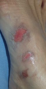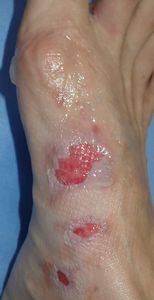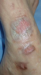 2016年1月30日,持っていたヤカンを落とし,右足にヤケド。2月1日,自宅近くの〇〇皮膚科を受診。水疱膜を取って軟膏ガーゼで処置。処置後,痛みがひどくなり,遺体で歩けなくなった。ネットで熱傷治療について検索。