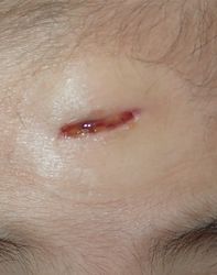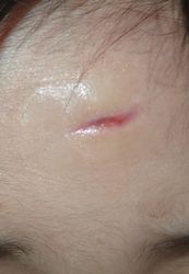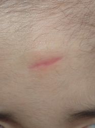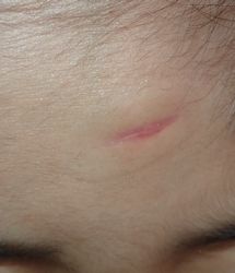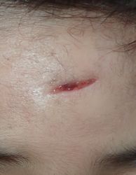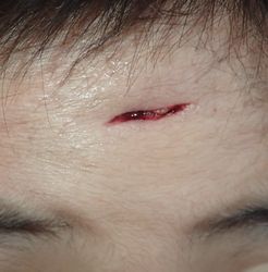 2016年2月16日,風呂場で転倒して前額部正中を裂傷。直ちに当院ERを受診。当直医はテーピングのみを行い,圧迫はせずにフィルム保護。帰宅後,血液してフィルムが浮き上がり,テープは全て剥がれていた。しばらく創部を押さえていたら出血が止まったため,常備してあったキズパワーパッドを貼った。