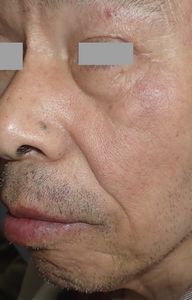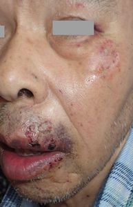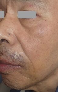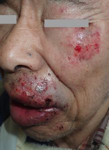65歳男。 2016年3月28日夜,駐車場で転倒して顔を擦りむいた。29日,当科を受診。ハイドロコロイド被覆材で治療。