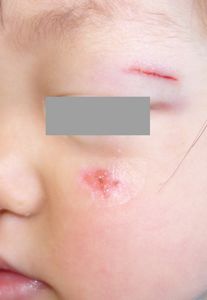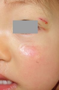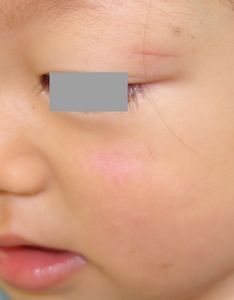 1歳5ヶ月女。 2016年5月17日,自宅で転倒し左上眼瞼裂傷。直ちに当院ERを受診し,テーピングで治療。18日,当科を受診。ハイドロコロイド被覆材で治療。